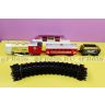 Поезд работает от батареек, при движении у него светится прожектор, специальный звуковой модуль издает звуки, из трубы идет имитация дыма.