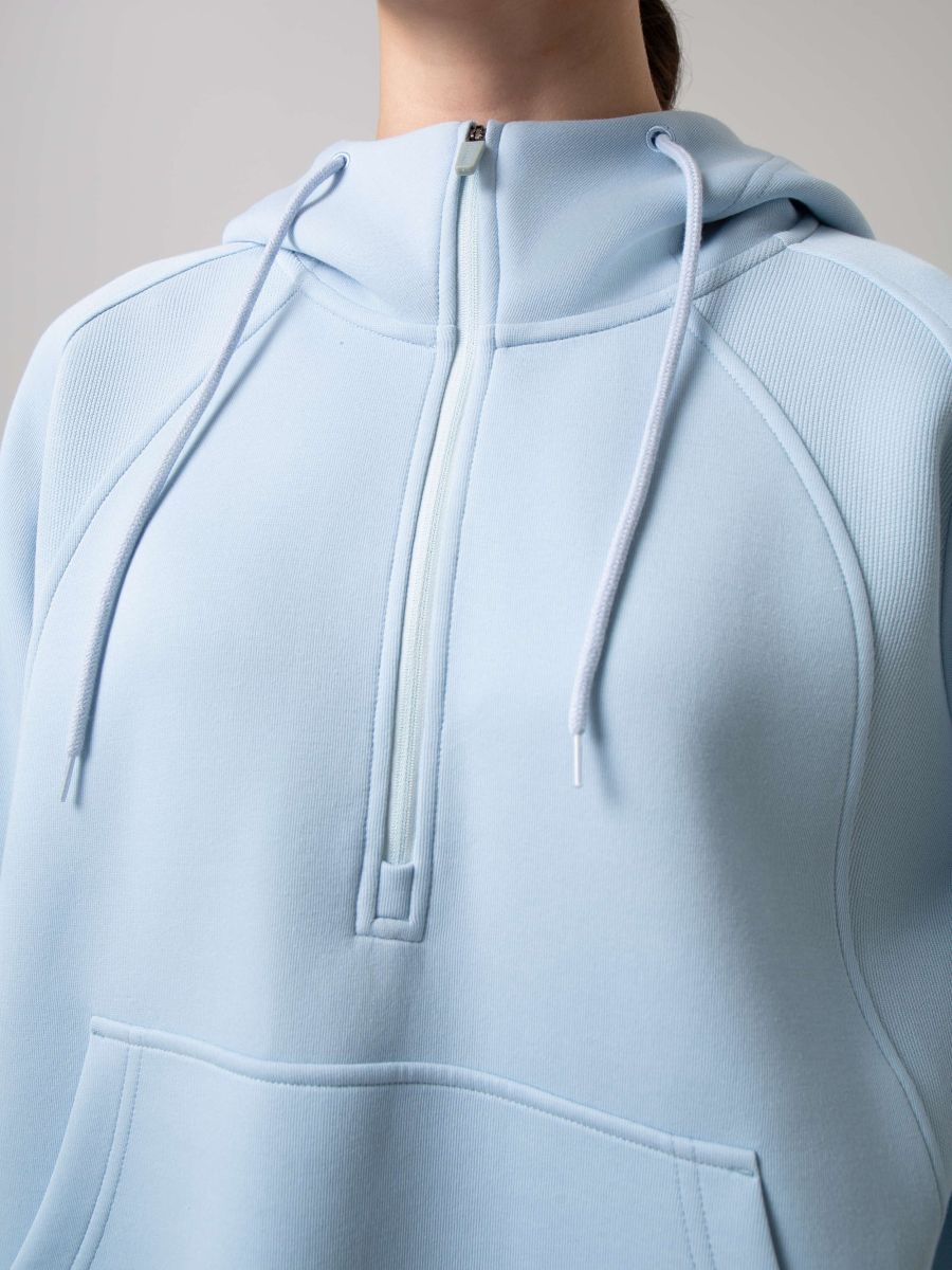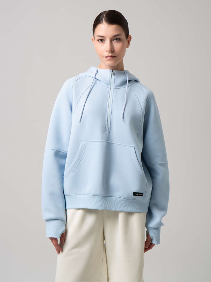 Стильное однотонное женское худи с капюшоном, короткой молнией и карманом-кенгуру из плотного двухстороннего трикотажа на основе хлопка и полиэстера, хорошо пропускающего воздух и впитывающего влагу. Применение технологии Sorona наделяет этот материал такими свойствами как лёгкость, эластичность, износостойкость и мягкость, всё что нужно для комфортного использования на каждый день. Способствует оптимальной терморегуляции, дышит и сохраняет тепло. Обладает антибактериальными свойствами, препятствует образованию неприятного запаха. Также используется технология 5А, которая обеспечивает ответственное производство без вреда для природы и безопасное использование для людей. Такой материал обеспечит комфорт в прохладную погоду. Худи идеально сочетает в себе удобство и модный молодежный стиль. Классическая модель с логотипом в тон основного материала универсальна для разных случаев — будь то прогулка по городу, офис, встречи с друзьями. Удобный карман-кенгуру позволяет хранить мелочи, а удлиненные манжеты с вырезом под палец согреют руки в прохладное время года. Глубокий капюшон с регулировкой эффектно подчеркнет непринужденный стиль и защитит в прохладную погоду от ветра и холода. Короткая молния позволяет удобно одевать и снимать эту модель, а также несет в себе элемент декора.