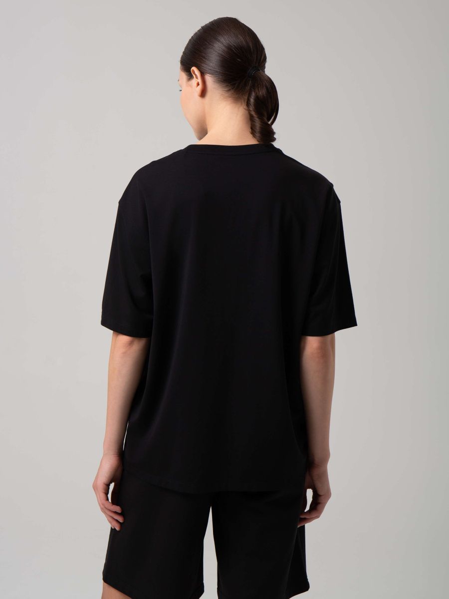 Продуманный повседневный женский гардероб строится на основе базовых изделий, которые легко добавить практически к любому образу. Футболка оверсайз дарит своей обладательнице ощущение свободы, расслабленности и непринужденности. Особенность изделия - свободный крой, который выглядит несколько больше, чем обычная футболка, скрывая контуры тела. Но при этом горловина и плечевые швы соответствуют пропорциям фигуры. Модель изготовлена из материала премиального качества – в основе вискоза для шелковистой фактуры, нейлон для прочности и спандекс для комфорта. Все эти компоненты дают такой мягкий, легкий, приятный на ощупь материал, отличается высокими тактильными показателями, износостойкостью и прочностью. Применение технологии Sorona наделяет этот материал такими свойствами как лёгкость, эластичность, износостойкость и мягкость, всё что нужно для комфортного использования на каждый день. Способствует оптимальной терморегуляции, дышит и сохраняет тепло. Обладает антибактериальными свойствами, препятствует образованию неприятного запаха. Используемая технология 5А обеспечивает ответственное производство без вреда для природы и безопасное использование для людей. Футболка декорирована крупным логотипом на груди в тон изделия. Вам будет максимально комфортно и удобно в любой ситуации – когда хочется выглядеть стильно и непринужденно одновременно или строго и официально, сочетая этот базовый предмет гардероба с любой вещью.