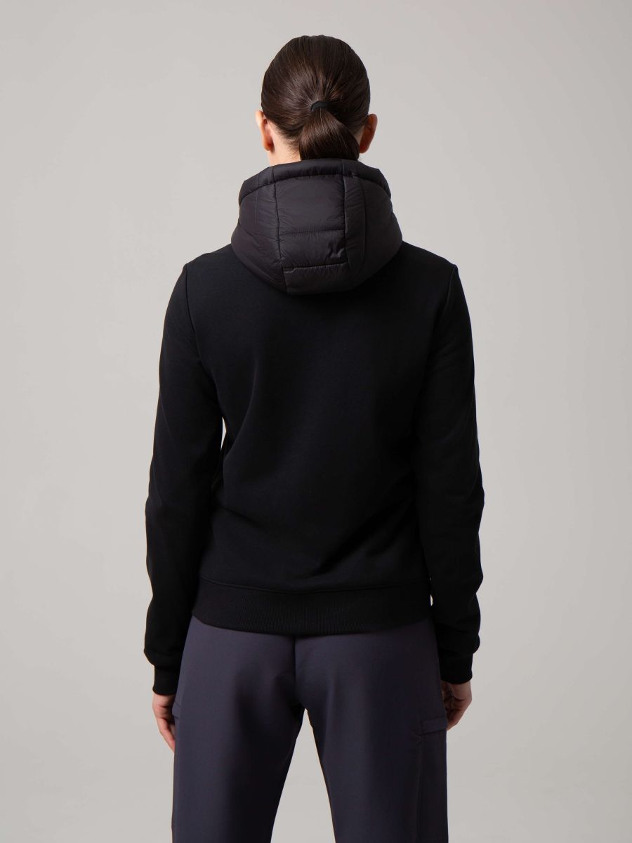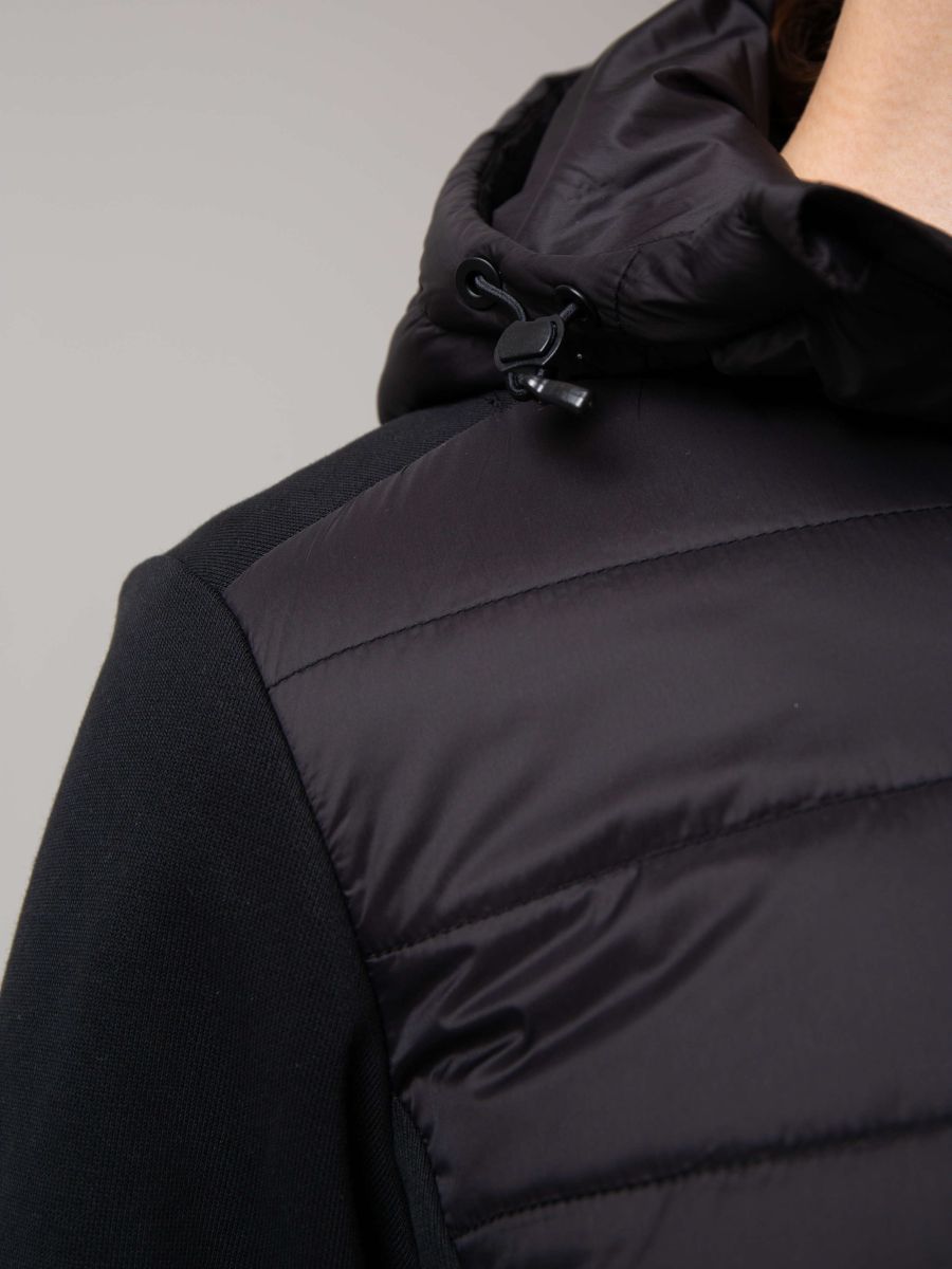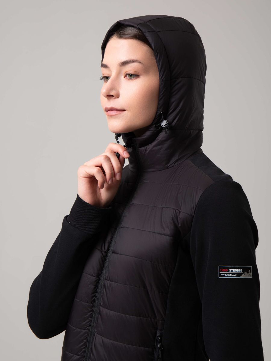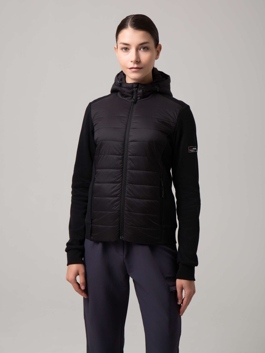 Женская толстовка-гибрид создана для того, чтобы сохранять тепло во время походов, прогулок и путешествий. Удобная и мягкая, она идеально подходит для походов в прохладную погоду. Ветрозащитный стеганый торс для большего комфорта и сохранения тепла. Глубокий капюшон и высокий воротник-стойка из защищают от ветра и непогоды. На воротнике есть защитная вставка над молнией, чтобы обезопасить подбородок от натирания. Толстовку можно носить, как второй слой одежды, так и как верхнюю одежду. Толстовка изготовлена из высокопрочного материала нейлон, не продуваемого и легкого, в комбинации с трикотажным материалом на основе хлопка и полиэстера. Таким образом, сохраняется прочность толстовки с течением времени, сохраняя при этом ее изолирующие свойства, чтобы обеспечить тепло и комфорт во время походов и максимально долго сохраняет его первоначальный внешний вид. Благодаря водонепроницаемой и «дышащей» пропитке A-RAIN PROF создается защитный слой от воды. Пропитка позволяет сделать ткань гидрофобной, что позволяет каплям воды не впитываться в саму ткань. Даже во время шторма пропитка выступает эффективным барьером, не пропускающим влагу, а также позволяет поддерживать тепло и сухость внутри изделия. Хорошая воздухопроницаемость для отвода влаги при активном движении. Толстовка не мнется, ее можно стирать в стиральной машине, благодаря полиэстеру в составе быстро сохнет.
